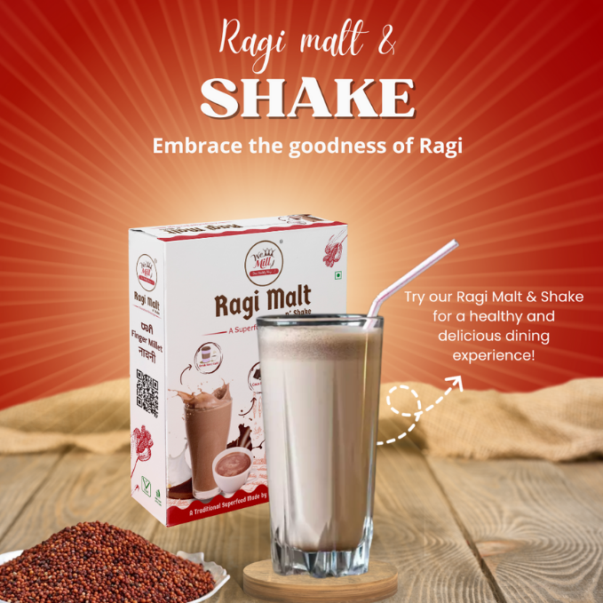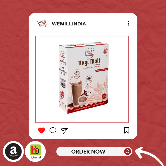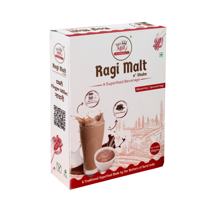 Savor the goodness of traditional Ragi with We Mill Ragi Malt & Shake, a delightful blend crafted to perfection. Using CFTRI Technology, we ensure that our shake is free from preservatives, allowing you to indulge in pure, natural goodness. Whether enjoyed as a standalone beverage or mixed with milk or butter milk, our Ragi Shake offers a rich and satisfying taste experience. Each sip of our Ragi Shake is a celebration of tradition and taste, delivering a wholesome experience that's as nourishing as it is delicious.